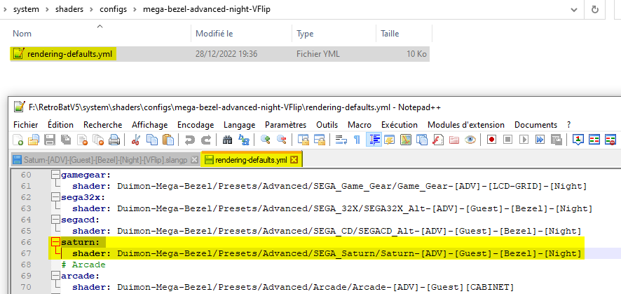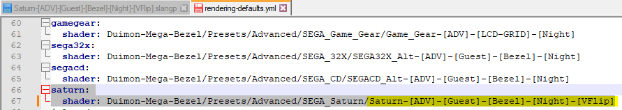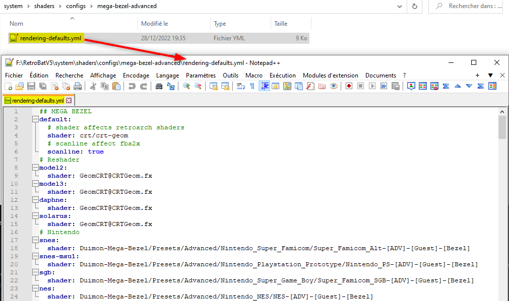 Inside the modified folder, open the file named "rendering-defaults.yml" (This is the file telling RetroArch what preset to use for a system).