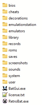 Une fois RetroBat installé, le répertoire contient les dossiers et fichiers suivants :